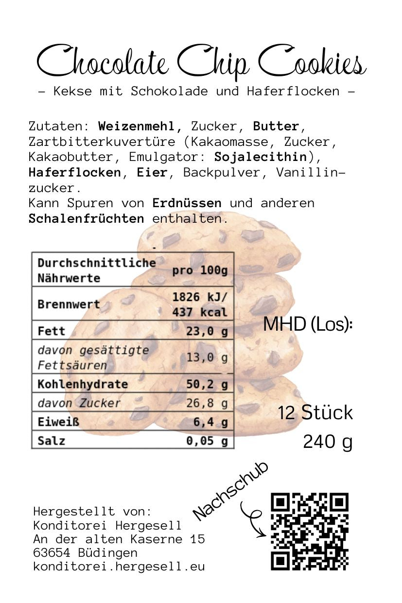 Zutaten: Weizenmehl, Zucker, Butter, Zartbitterkuvertüre (Kakaomasse, Zucker, Kakaobutter, Emulgator: Sojalecithin), Haferflocken, Eier, Backpulver, Vanillin-zucker.